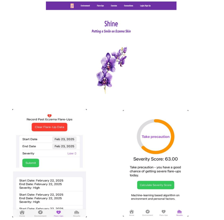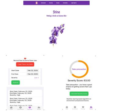 The machine learning model successfully demonstrated that a combination of sociodemographic, health history, and environmental factors can predict the probability of an individual having eczema. The statistical significance of temperature, humidity, and their interaction confirms that environmental variables are important predictors of eczema status. While the current model shows promising performance (AUC 0.774), there is significant potential for improvement through the addition of more feature variables and further finetuning. To translate these findings into practical applications, I developed a beta app and website called "Shine" that integrates the ML model with real-time weather API data and userinputted symptom severity levels. This combination enables personalized predictions of flare-up probability, empowering users to proactively track their eczema symptoms, identify potential triggers, and make informed decisions about their skincare, daily activities, and lifestyle management.