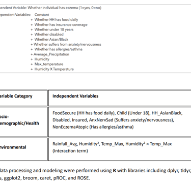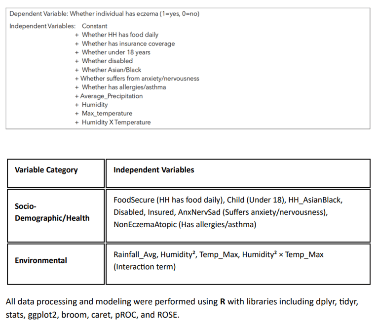 This research integrates health data from the 2021 National Health Interview Survey (29,482 adults and 8,261 children across 30,673 households) with environmental metrics from NOAA's Climate Data Online database. A logistic regression model was developed to predict eczema status, with ROSE oversampling applied to address data imbalance (11.7% eczema prevalence). The model incorporated socio-demographic, health history, and environmental predictors.