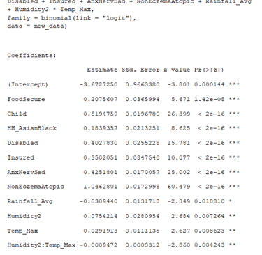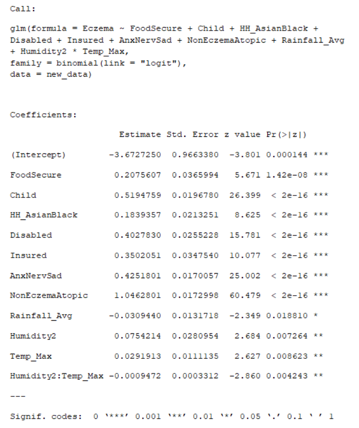 The final model coefficients demonstrate that several factors, including environmental variables, have a statistically significant impact on predicting eczema. The coefficients highlight several key findings: