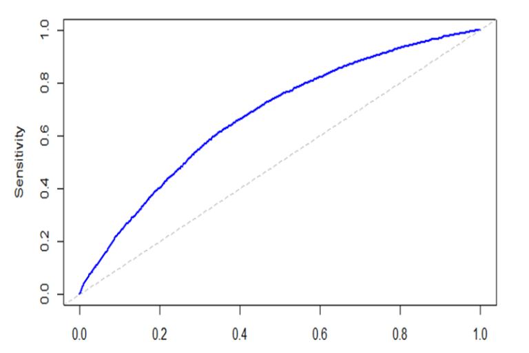 The logistic regression model achieved an Area Under the Receiver Operating Characteristic Curve (AUC) of 0.774. AUC quantifies the model's ability to correctly classify data, with a value closer to 1 indicating better performance.