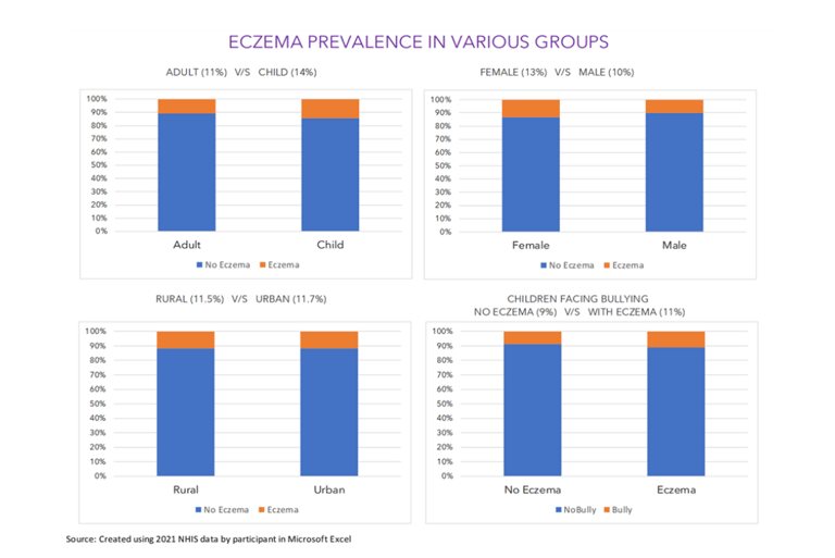 Eczema prevalence was observed to be higher in children (14%) compared to adults (11%) and in females (13%) compared to males (10%). Prevalence was similar between urban (11.7%) and rural (11.5%) residents. The data also showed that children with eczema faced a higher prevalence of bullying (11%) compared to children without eczema (9%).